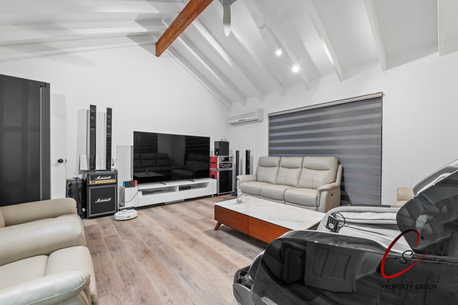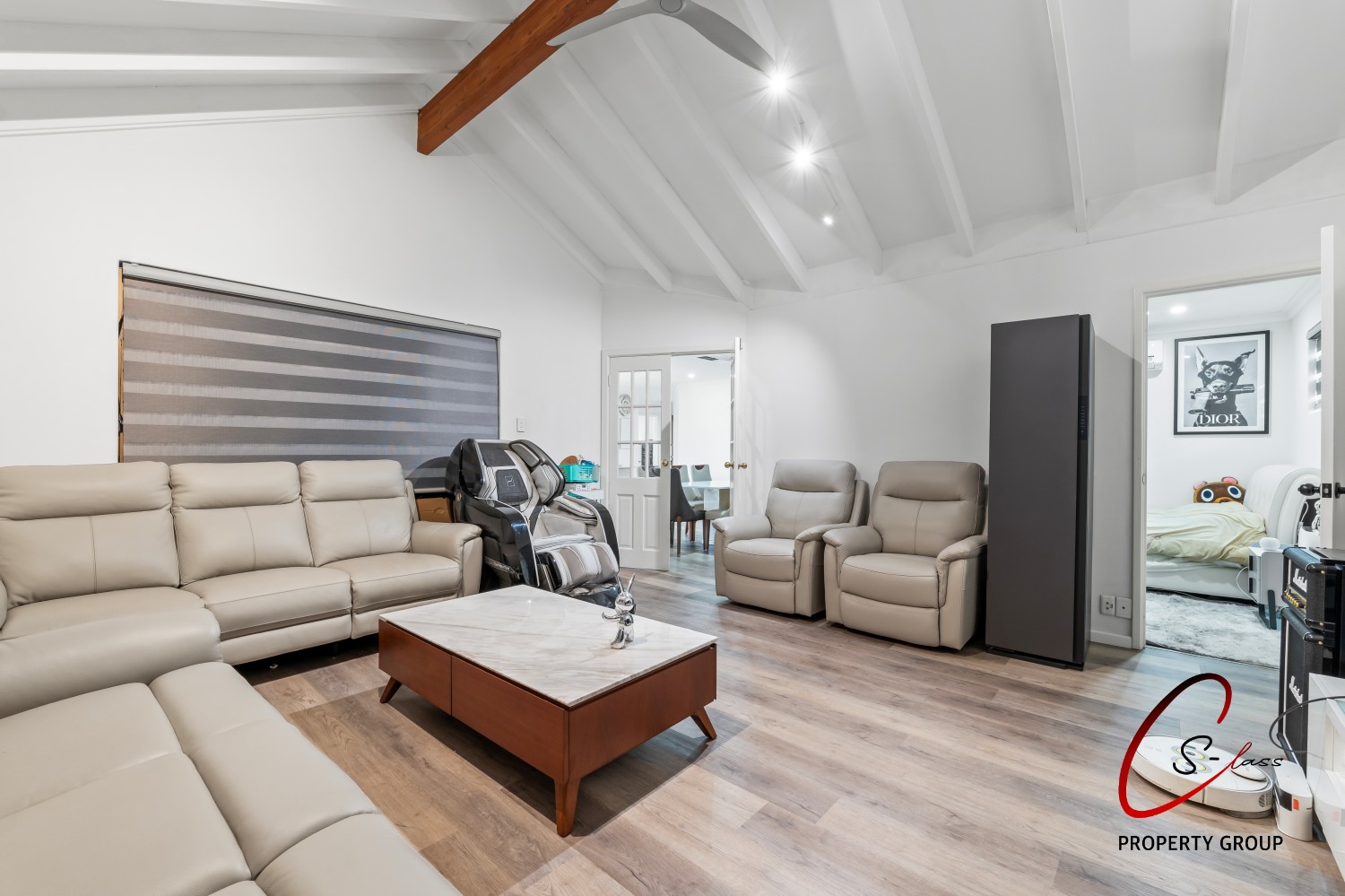 The fully renovated kitchen comes with a stone benchtop and ample storage with overhead cabinets and pantry. The open-design kitchen makes the dining area seem larger. To the left of the dining area, discover the spacious Theatre room with a separate bedroom. The bedroom can be used as a guest room or small activity room.
