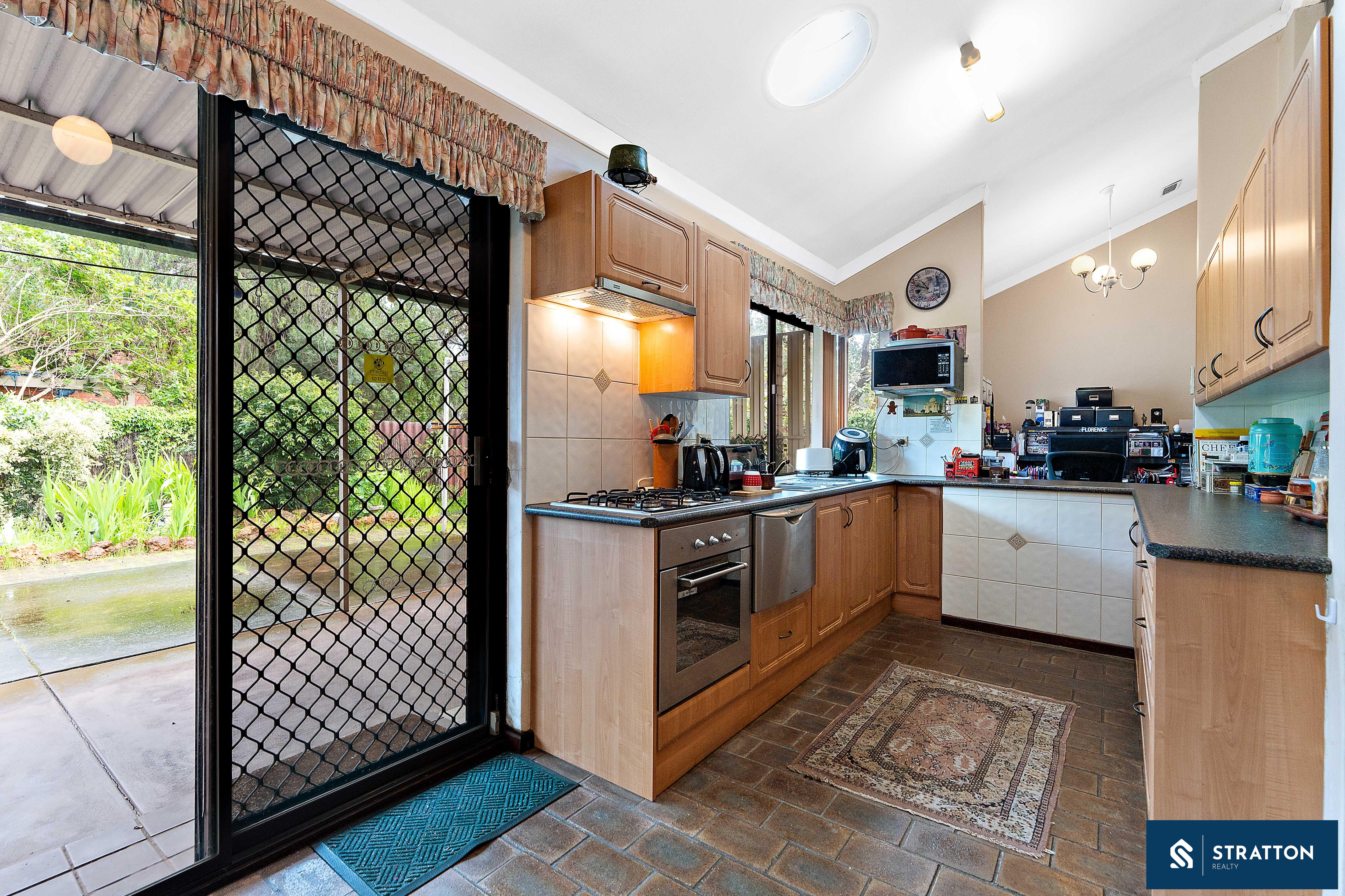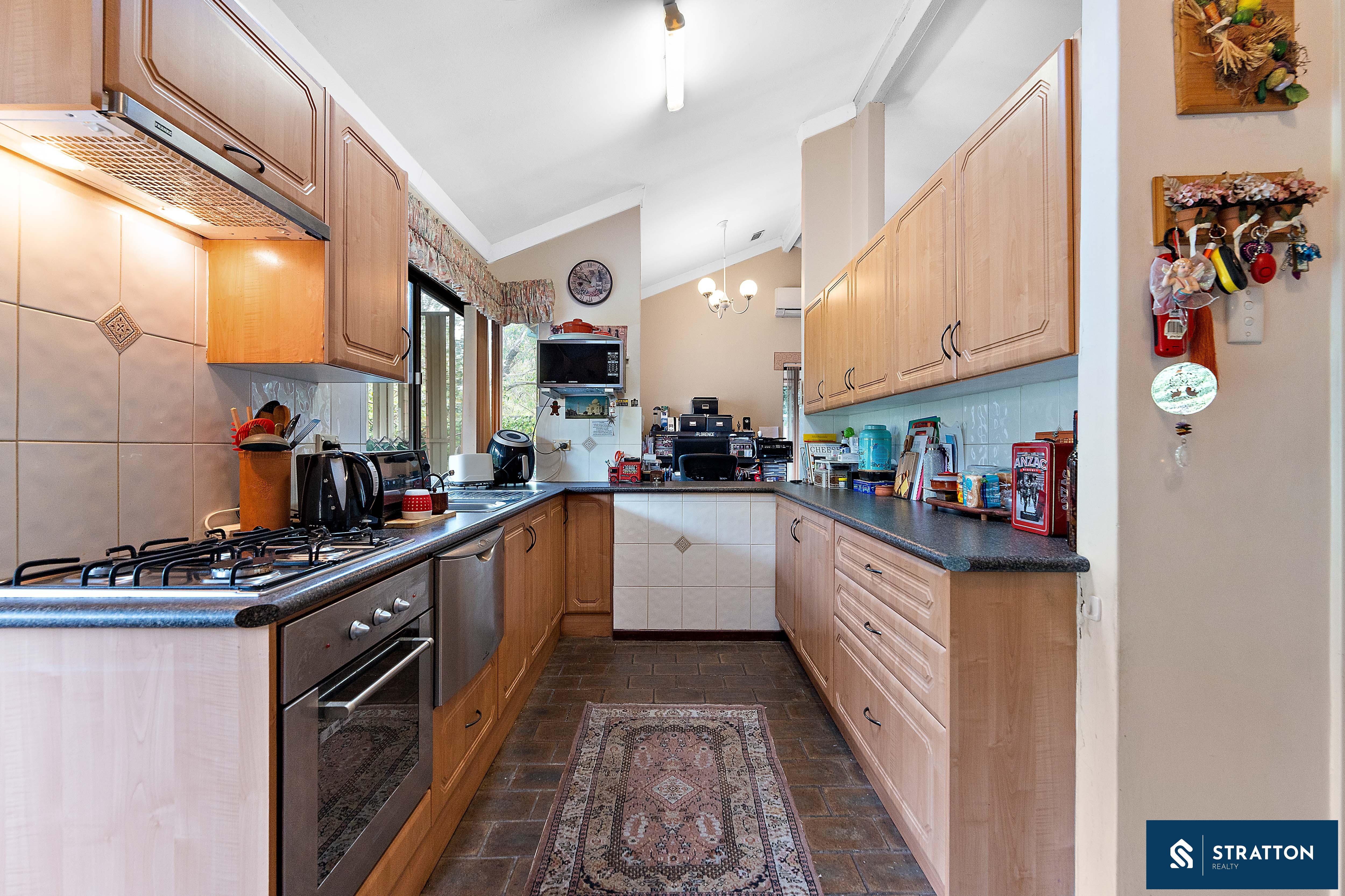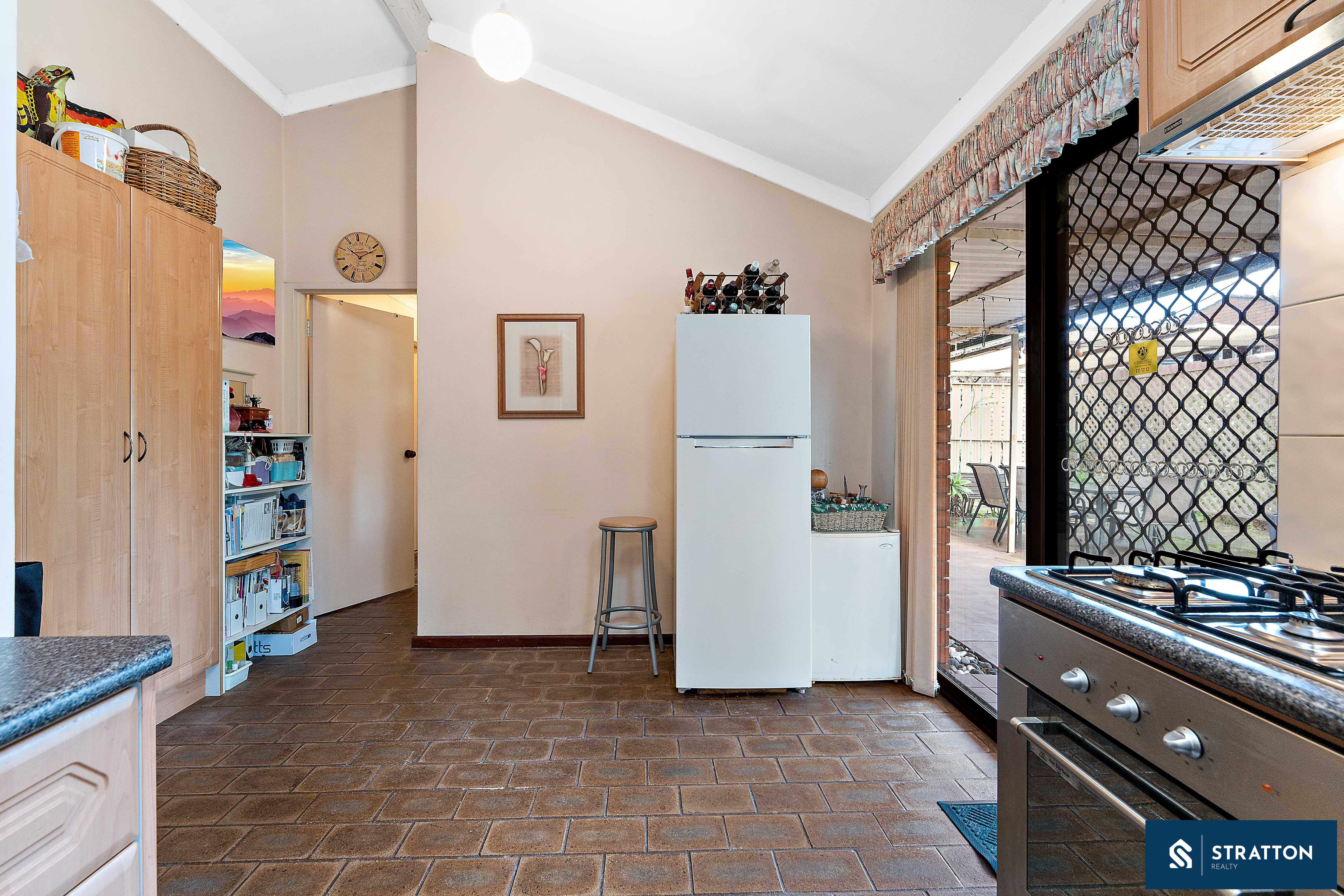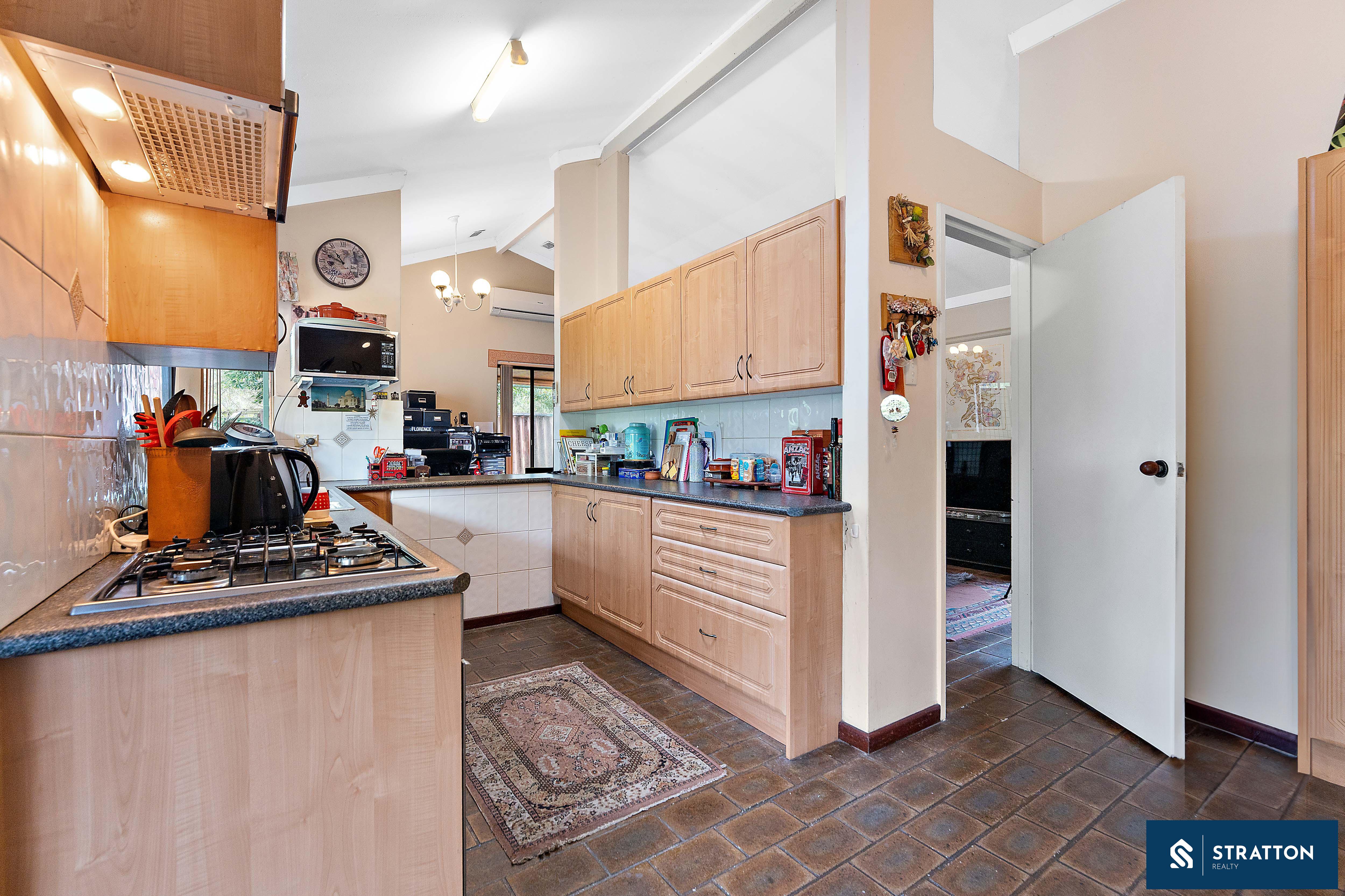 The kitchen boasts ample cabinetry, a 4-burner gas cooktop, a built-in dishwasher, and a skylight, with direct access to the backyard for added convenience. The master bedroom includes a built-in robe, backyard access, and carpet flooring, with a semi-ensuite bathroom featuring a bathtub and heat lamp. The second and third bedrooms also have carpet flooring and share the well-appointed bathroom.