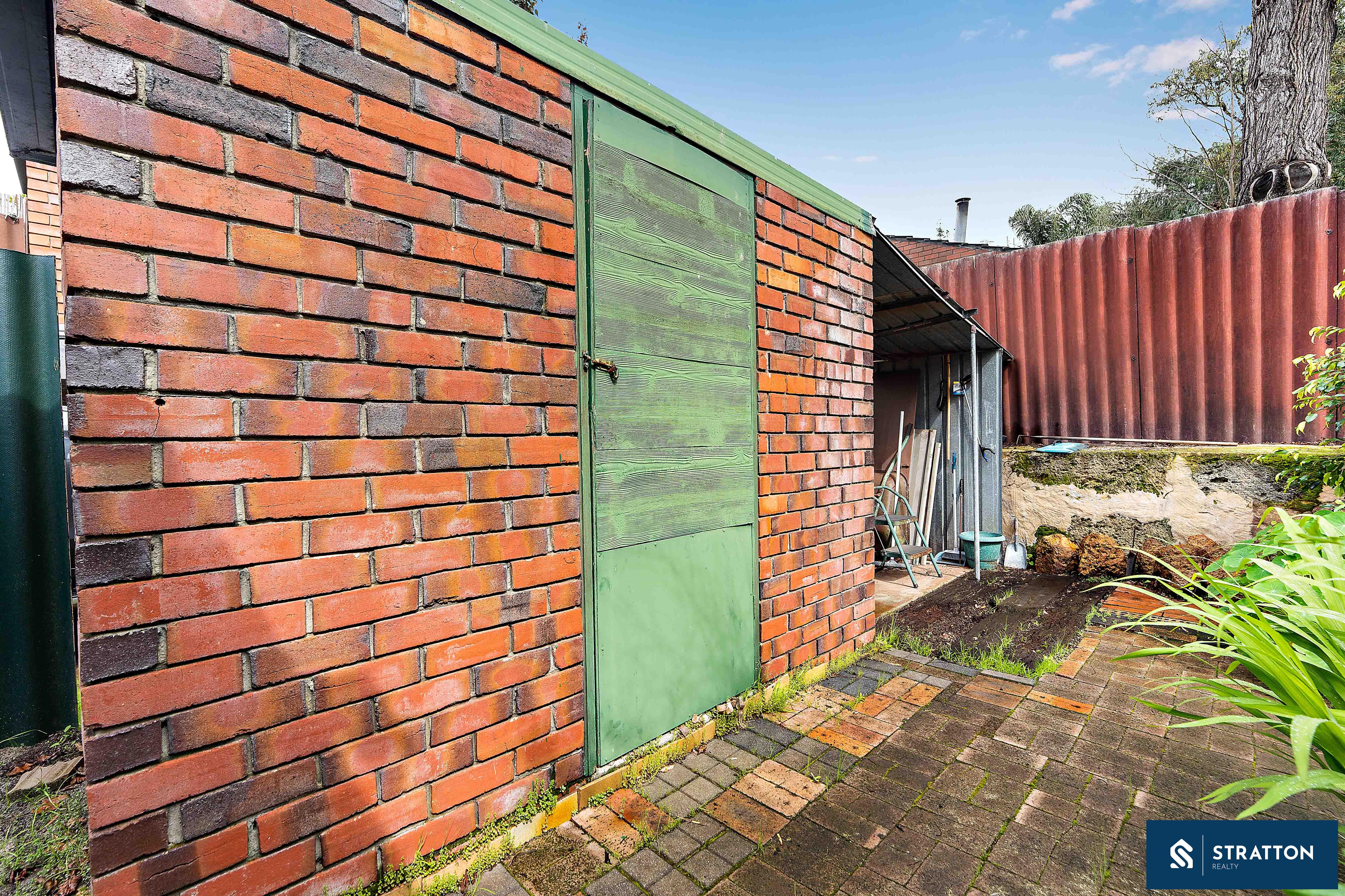 The laundry area includes a bench, overhead cabinets, a built-in linen closet, and backyard access, while the separate toilet adds extra convenience. The backyard is a low-maintenance oasis, primarily paved with a patio area and an extra storage unit.