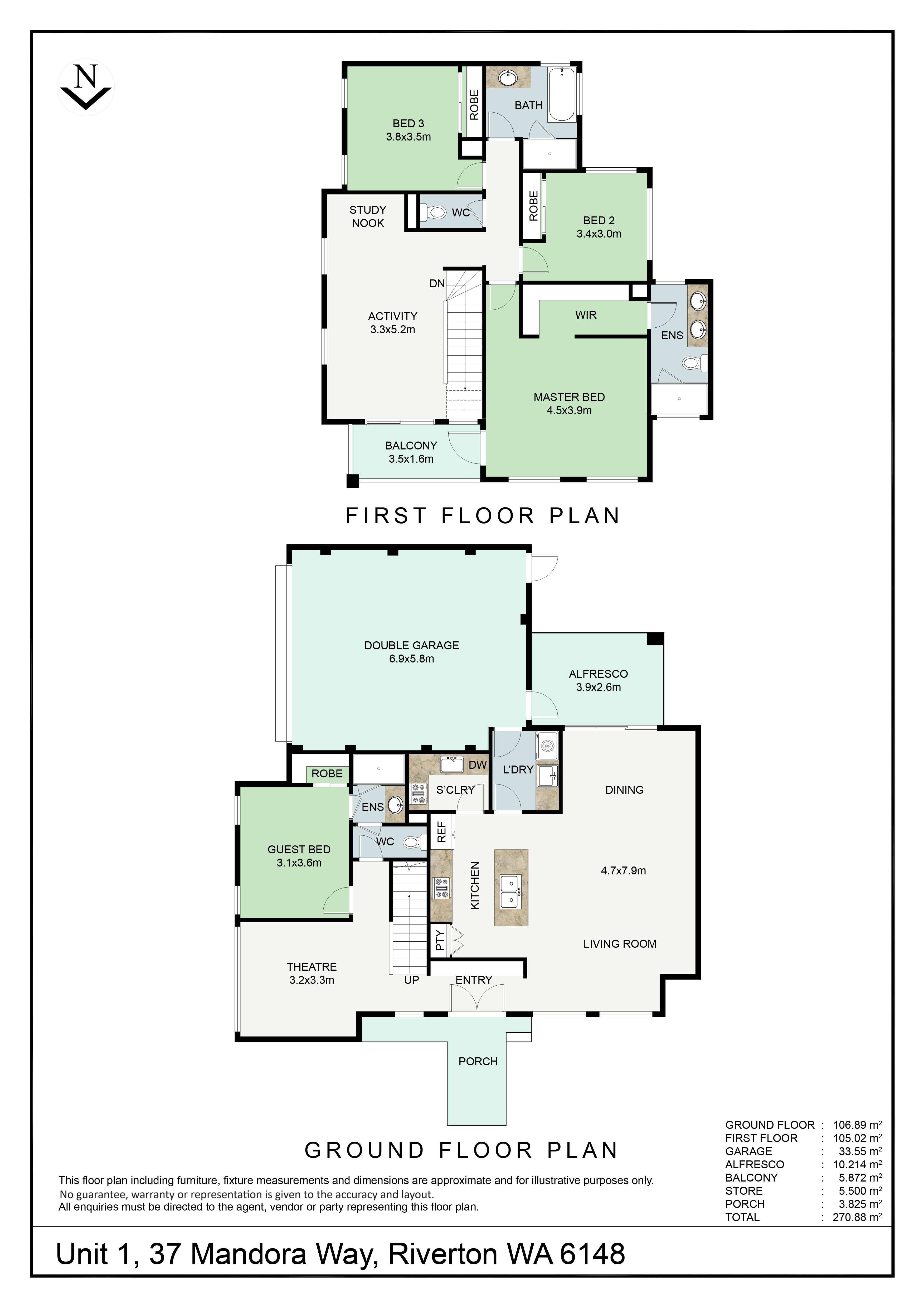 Spacious master bedroom features walk-in fitted wardrobe; ensuite comes with double vanity basins & shower Two other large bedrooms on first floor both with built-in wardrobes Common bathroom features stone vanity top & bath Three toilets Alfresco for outdoor living Ducted refrigerated air con system Double garage with automatic door 270 sqm total area approx. 232 sqm survey strata block approx. with NO strata levies (common driveway insurance may be required)
